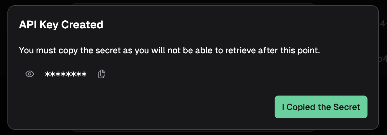 A popup will appear confirming creation of the new API key, along with the ability to view and/or copy the key. NOTE: The key will not be viewable once you close this box. Be sure to copy the key and store it somewhere secure before clicking "I Copied the Secret".