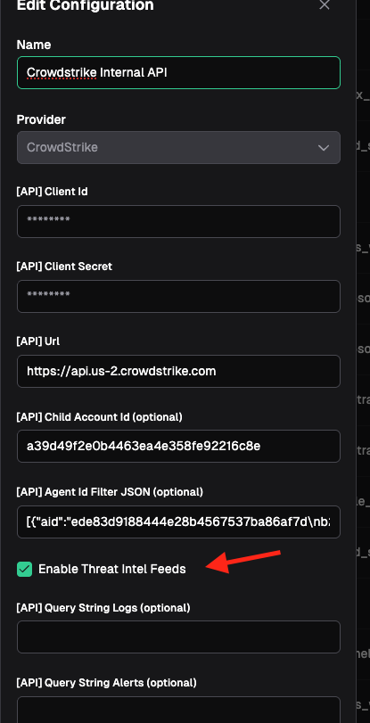 Next, in the platform go to Integrations and select your CrowdStrike integration. Scroll down and click the checkbox for "Enable Threat Intel Feeds."
