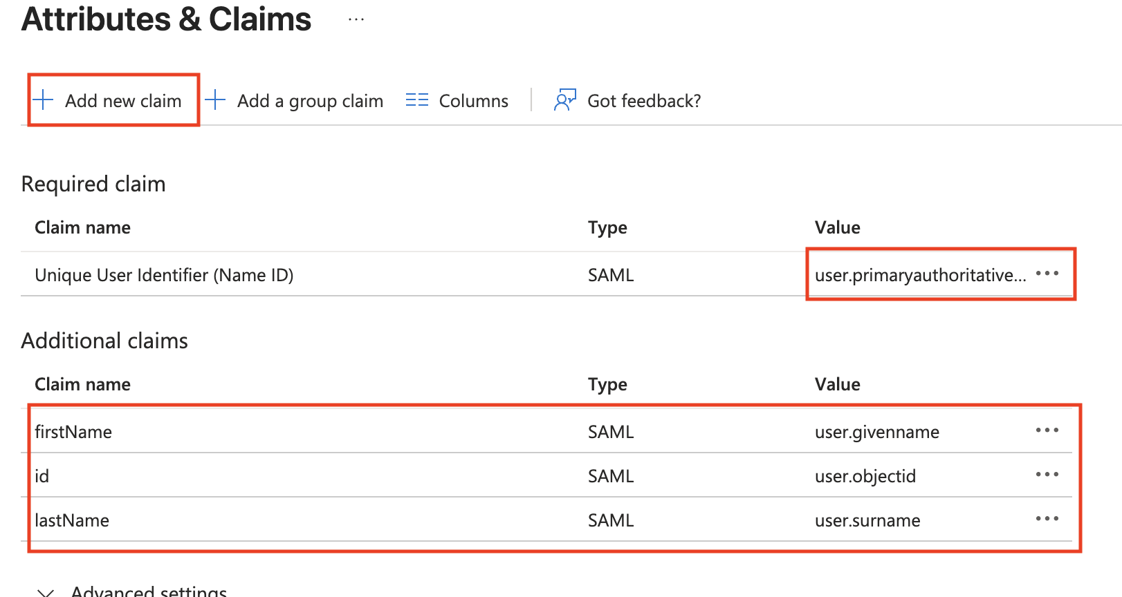 Next, delete the default “Additional Claims”, click “Add new claim” and add each of the below individually.