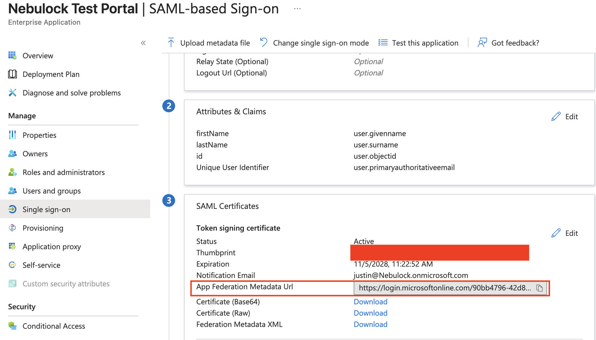 Next copy your App Federation Metadata URL and send this to the Nebulock team.