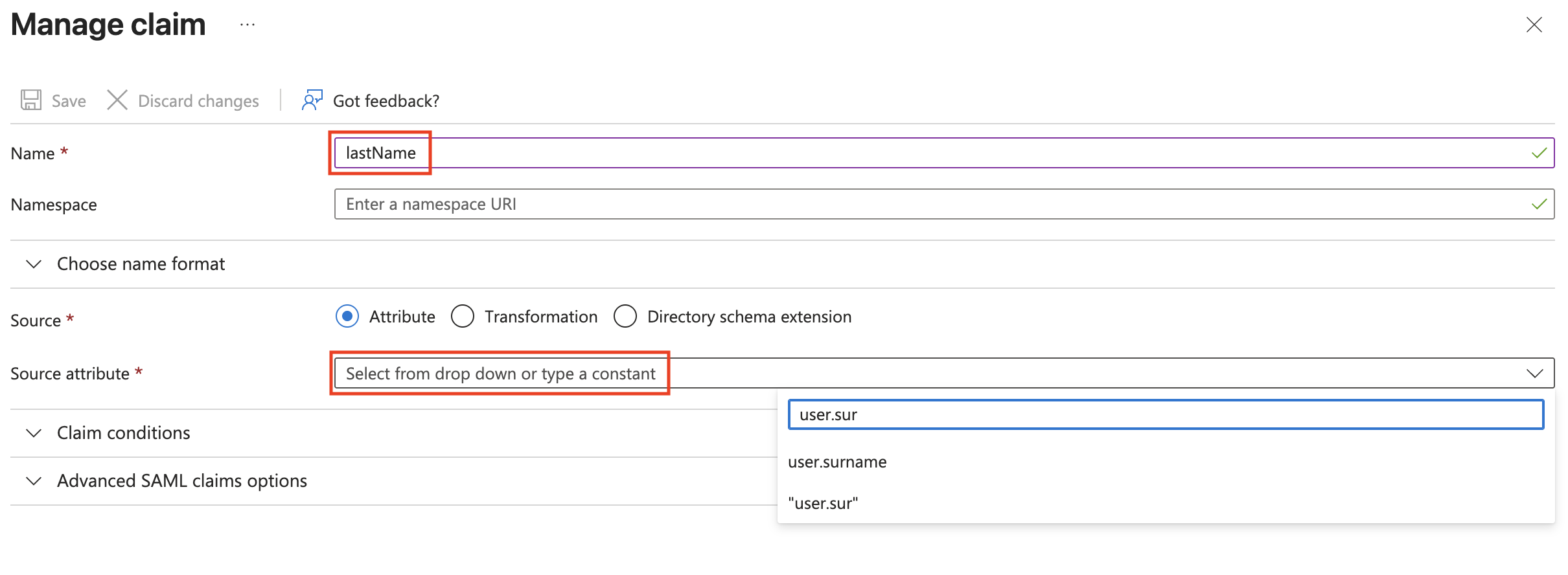 lastName, Source Attribute:user.surname - Claim Name: