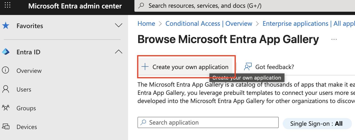 Login to your EntraID portal, and navigate to “Enterprise Apps” and “New application” in the left menu.