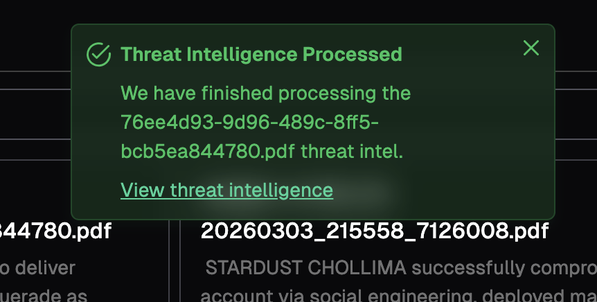 Once the report is finished, you will see another pop-up to indicate the report has been processed. Click the link in that window to view the uploaded intelligence.