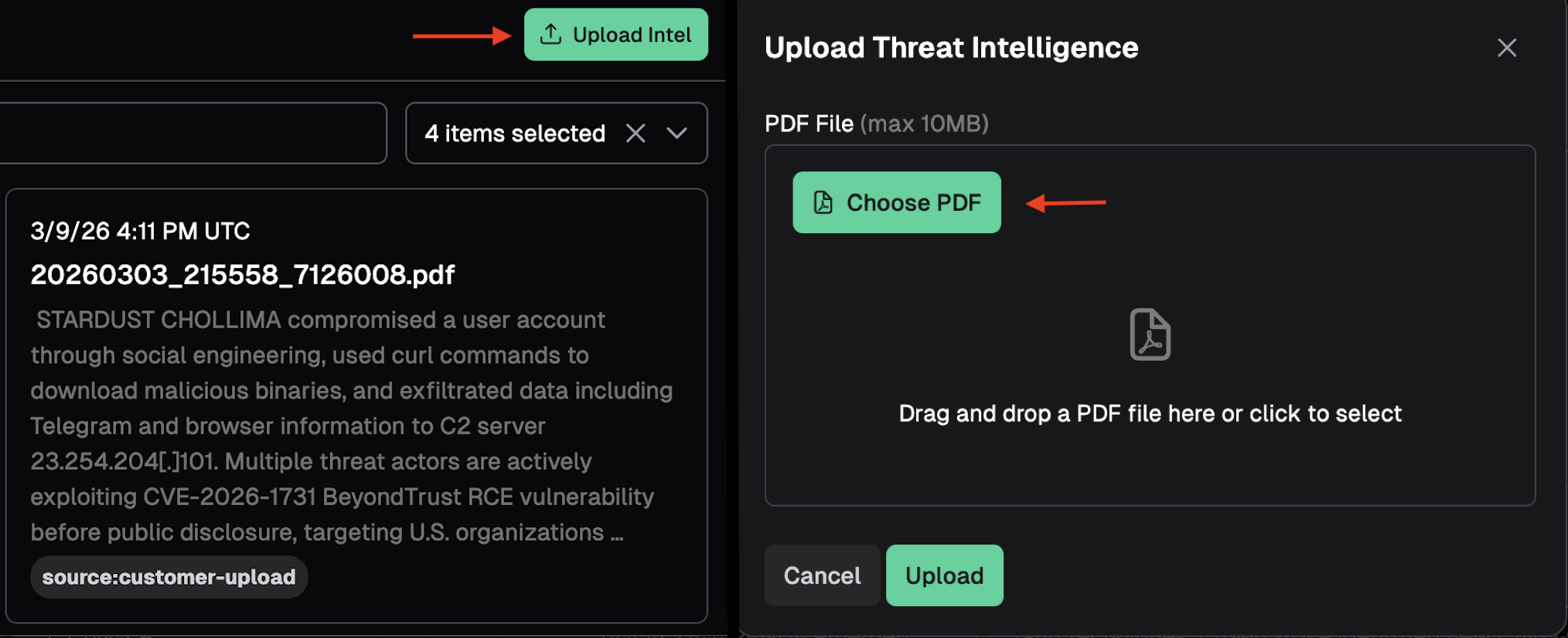 At the top right of the Threat Intel page, click "Upload Intel", and in the the pop-up window you can click to open an Explorer window and choose a file, or you can drag and drop a PDF into the window. Once selected, click "Upload" to begin processing the report.
