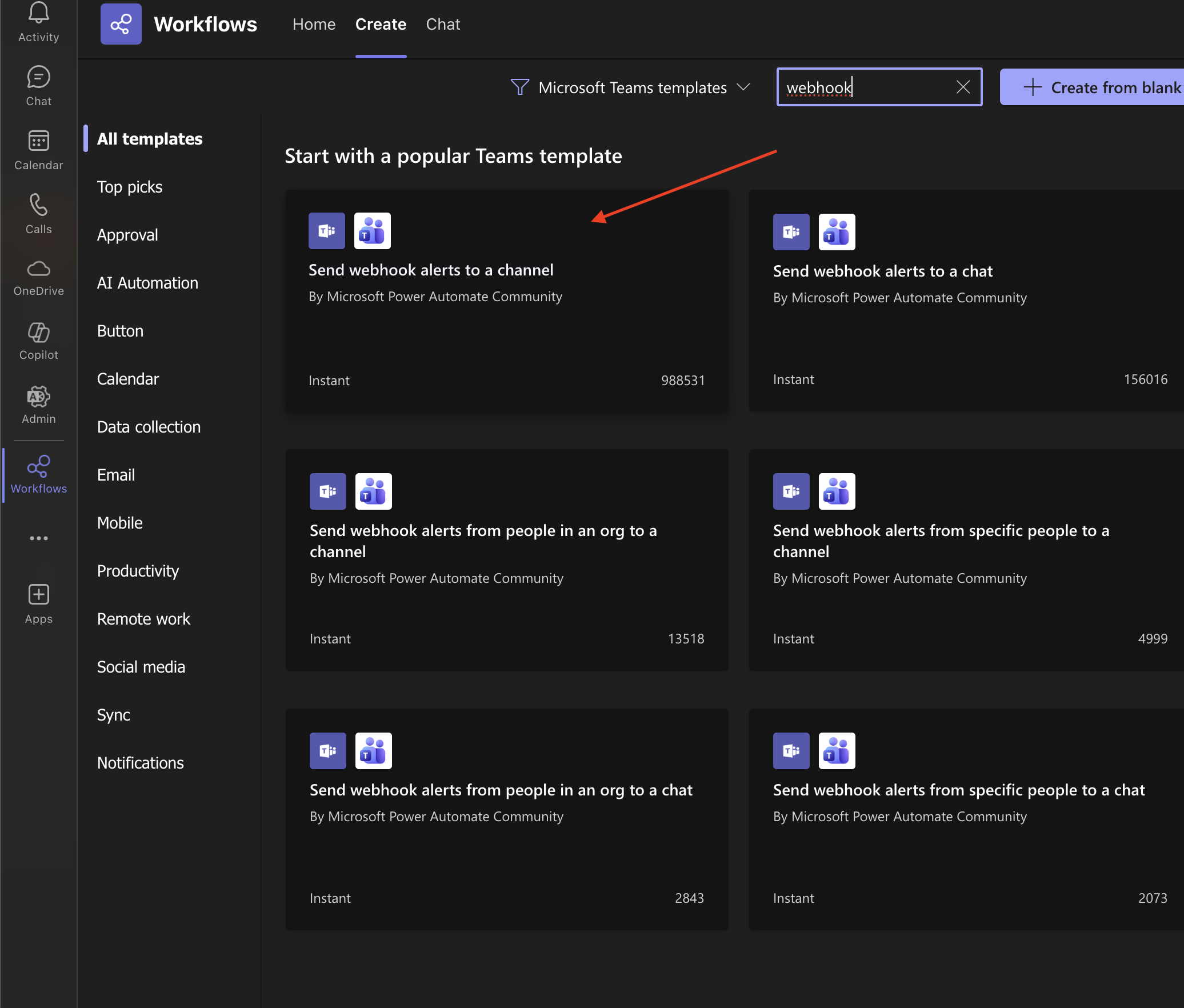 In the search bar, type "webhook" and look for the "Send webhook..." template.