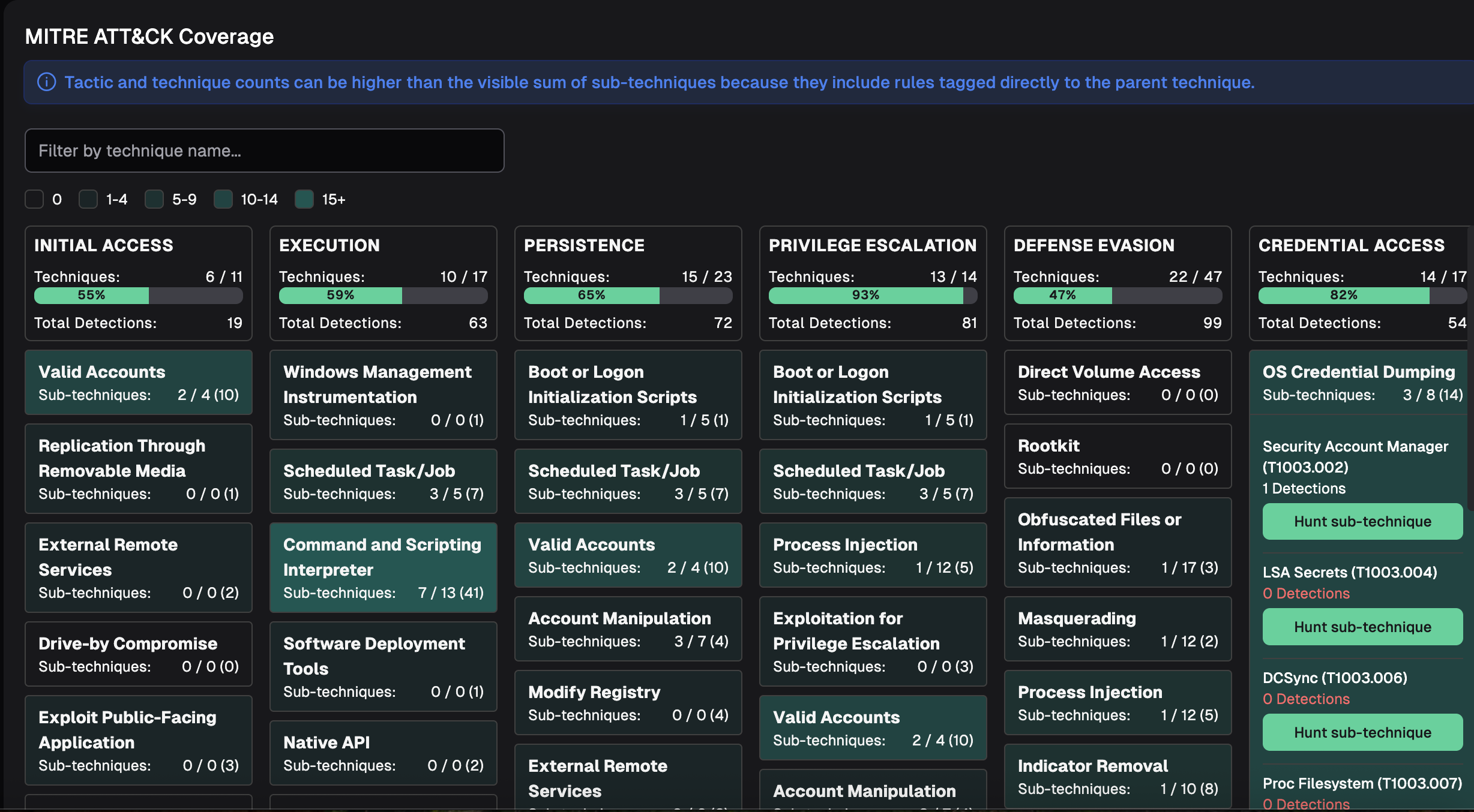 Each Technique card shows the number of Sub-techniques covered by rules, e.g., 1 / 5, 2 / 4. Plus, the total number of rules for this technique will be displayed in parenthesis.