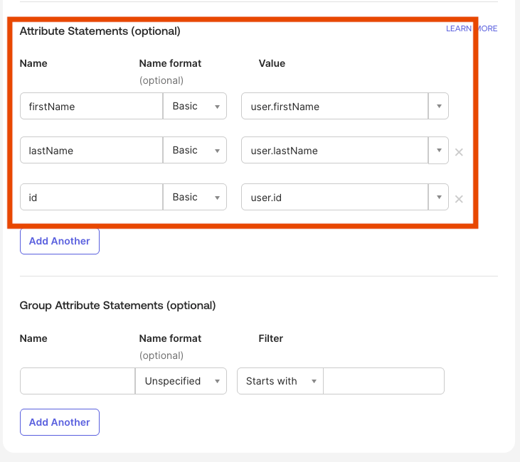 - Name: lastName | Name Format: Basic | Value: user.lastName