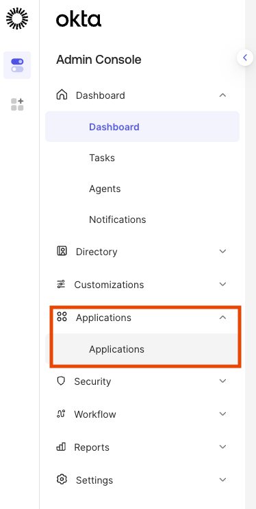 Log into Okta with an account that has administrative privileges, and navigate to the Admin Console. From the there, navigate to Dashboard -> Applications.