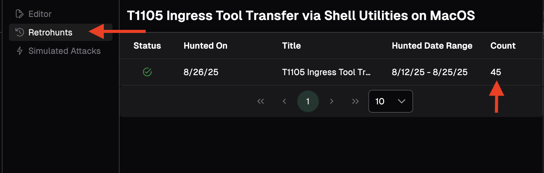 While the Retrohunt is running, you can navigate to other parts of the platform. When the Retrohunt is complete, you can return to Detection Rules and select Retrohunts from the left panel to view all executed Retrohunts for this rule.