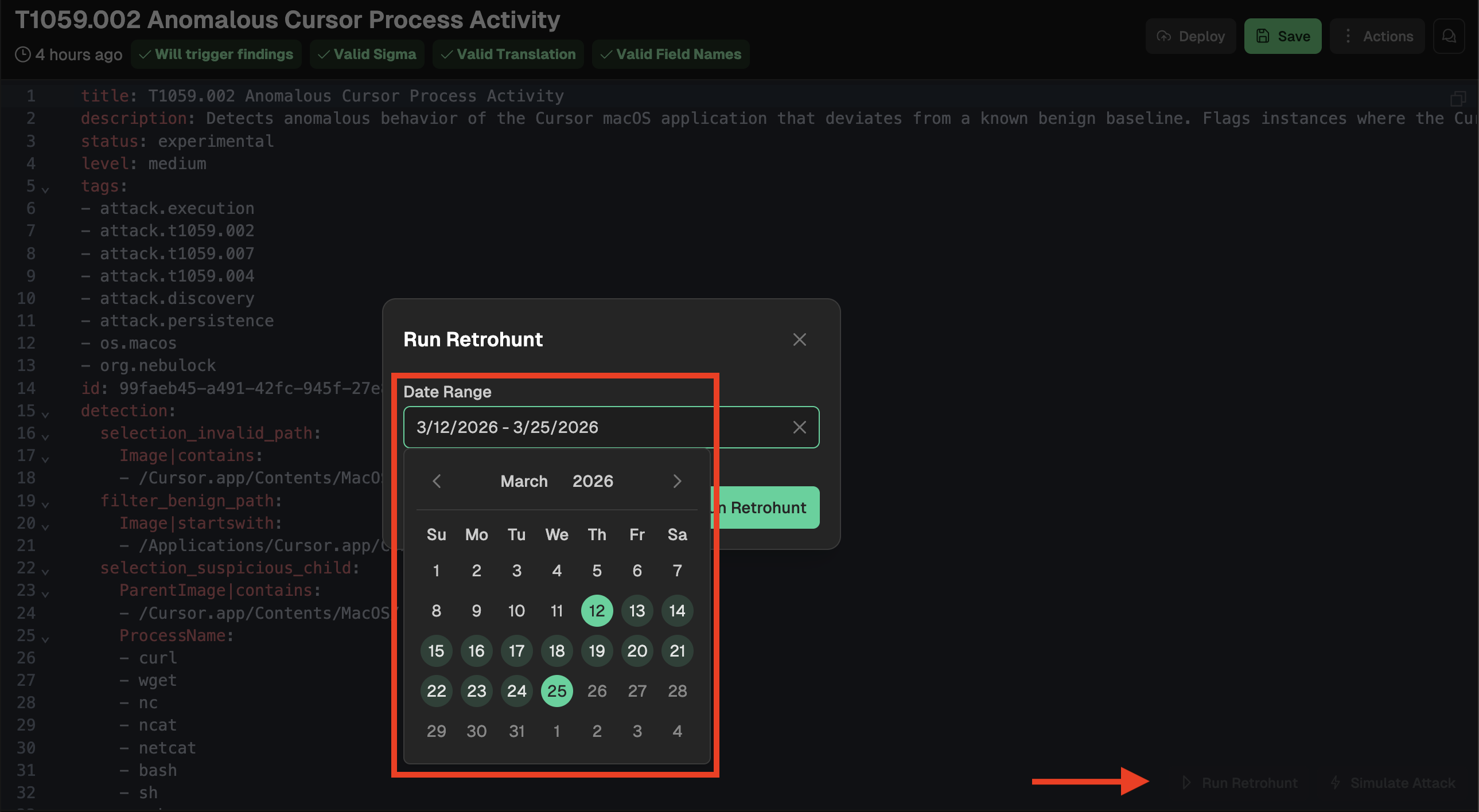 From Detection Rules, you can select Retrohunt to do a historical search in your data using the rule logic. Clicking this action will pop up a date picker window for selecting your time frame: the max window for a Retrohunt is two weeks. NOTE: You can select any two week time period as far back as your data goes in Nebulock (not just the most recent two weeks). For faster Retrohunt processing, select a smaller time window or a period of time where you know the activity exists.