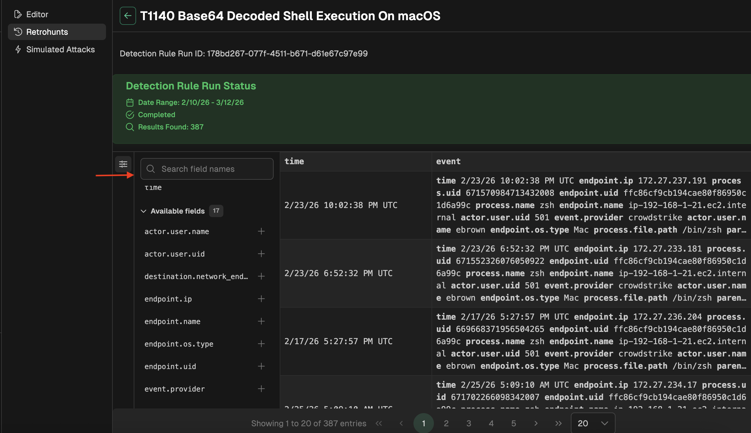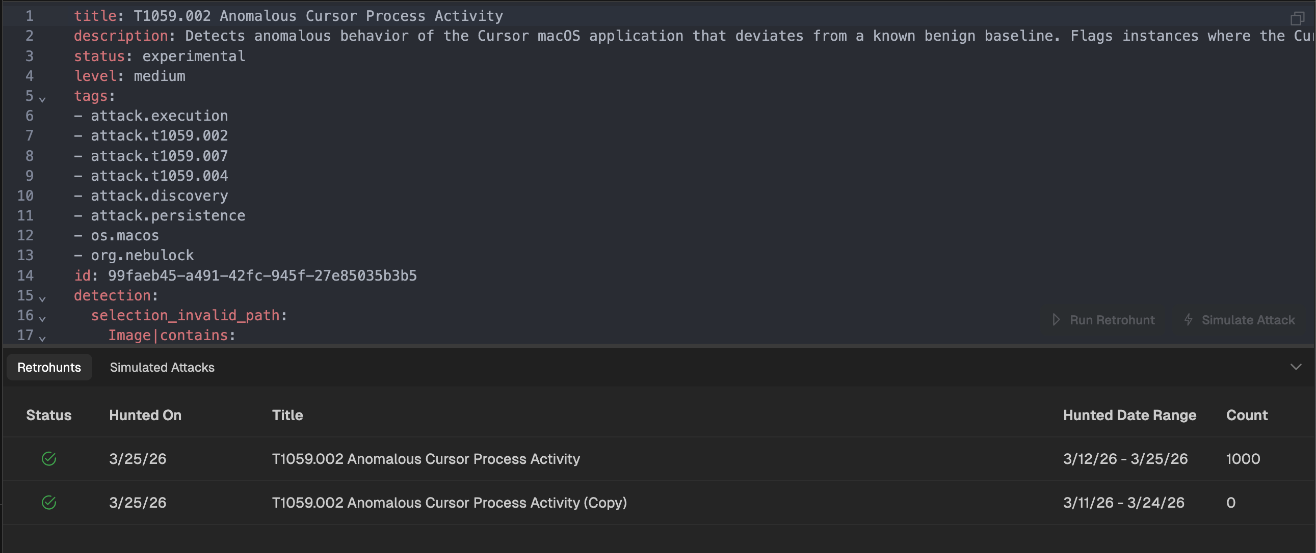 While the Retrohunt is running, you can navigate to other parts of the platform. When the Retrohunt is complete, you can return to the specific detection rule page and select Retrohunts from the bottom panel to view all executed Retrohunts for this rule. NOTE: Retrohunts will return a maximum of 1,000 results. When you see 1,000 it means the retrohunt hit its max results. This typically indicates a rule is too broad and needs refinement._
