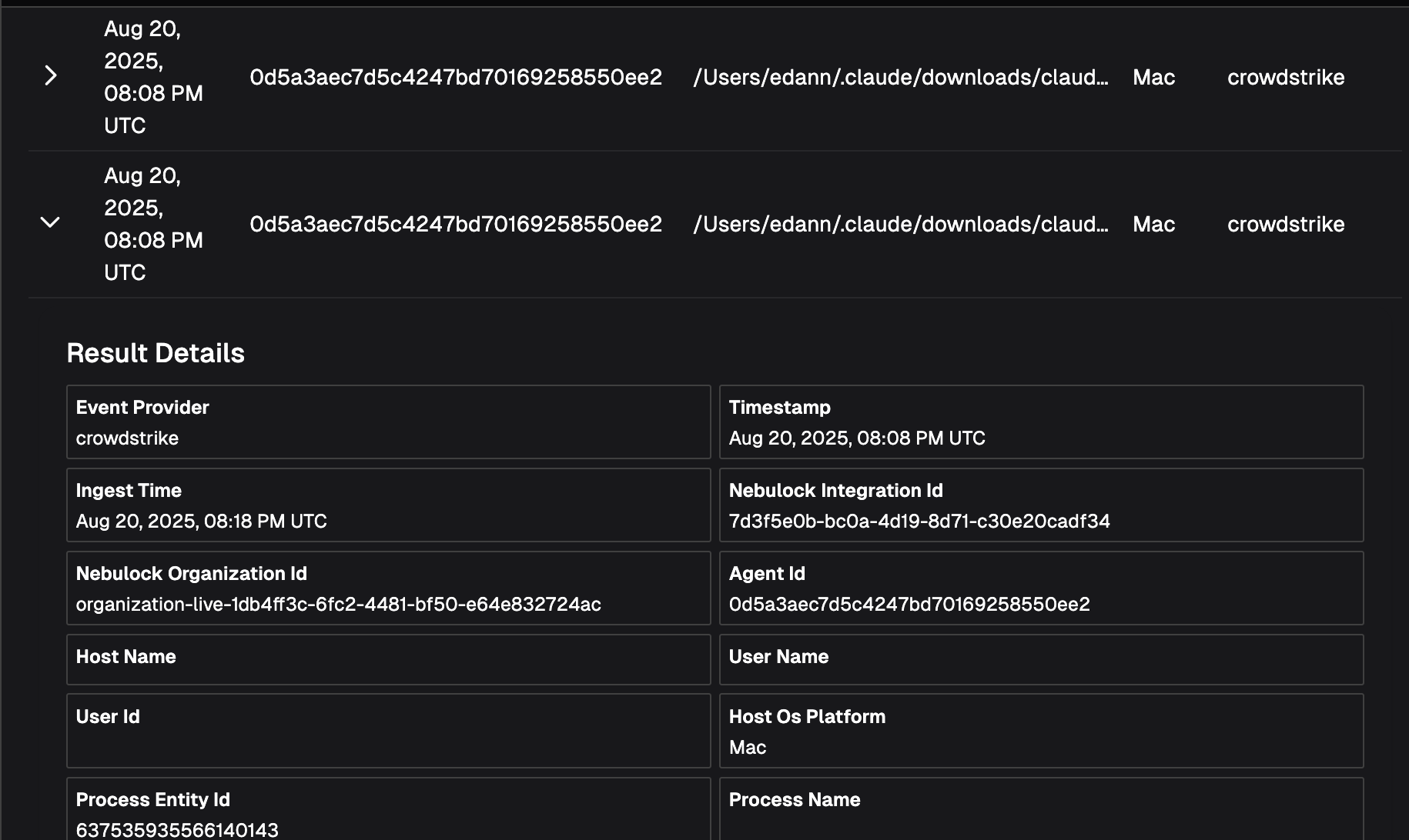 Results are displayed in a tabular format, where each row is a single match to the rule. Expand the result to view the event details.