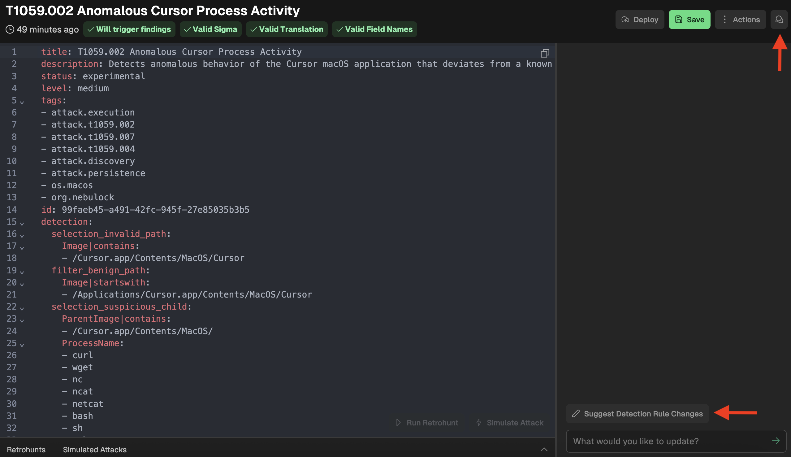 - Use the Suggest Rule Changes button to have the rules agent provide options to improve the rule. NOTE: To use this feature, you must first run a Retrohunt. The rules agent uses the results of the retrohunt to make suggestions.